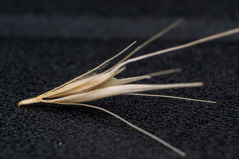 Foxtails are spiky and hard and they are designed to burrow to spread and this same design makes it easy for them to latch onto animal fur and penetrate the skin. The barbs of the foxtail embed the seed in the skin, or into the ears, eyes, nose, and paws.
